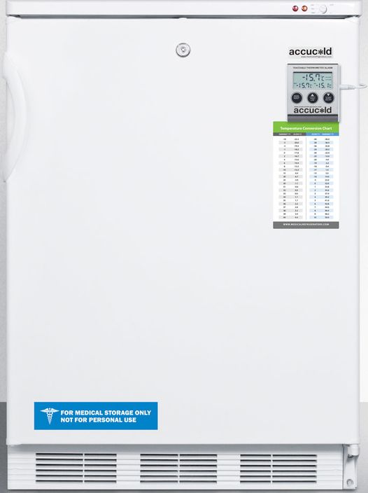 Accucold by Summit Appliance's MED series all-freezers come fully featured for stabilized temperature performance for use in medical, scientific, pharmaceutical, and laboratory institutions. The VT65MLBIMED has a 24" footprint and can be used built-in or freestanding. It comes in a white finish and includes a front-mounted lock for added security. The manual defrost VT65MLBIMED operates several degrees colder than most freezers for safe long-term storage of food, vaccines, or pharmaceuticals. Temperatures can reach and maintain -25º C. Three removable pull-out basket drawers provide convenient storage solutions, while extra thick insulation limits energy waste and keeps the cold inside. We include an audible NIST calibrated temperature alarm complete with an external display of the current and high/low temperature mounted on the door. A green dot hospital grade plug is installed for added safety in high traffic areas. An access port allows users to connect their own monitoring equipment. With its slim size and reliable construction, the VT65MLBIMED works well in any setting in need trusted storage. Additionally, we offer a variety of options to customize this unit, including USB data loggers, digital thermostats, self-closing doors, and more.