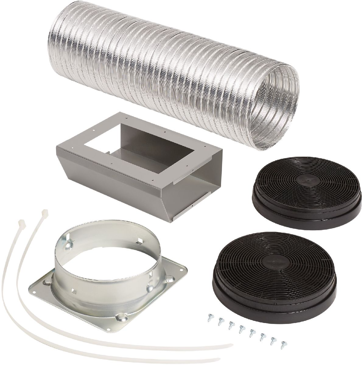 Kit includes non-duct plenum, 6" diameter flexible aluminum duct, two non-duct filters, round adapter and hardware