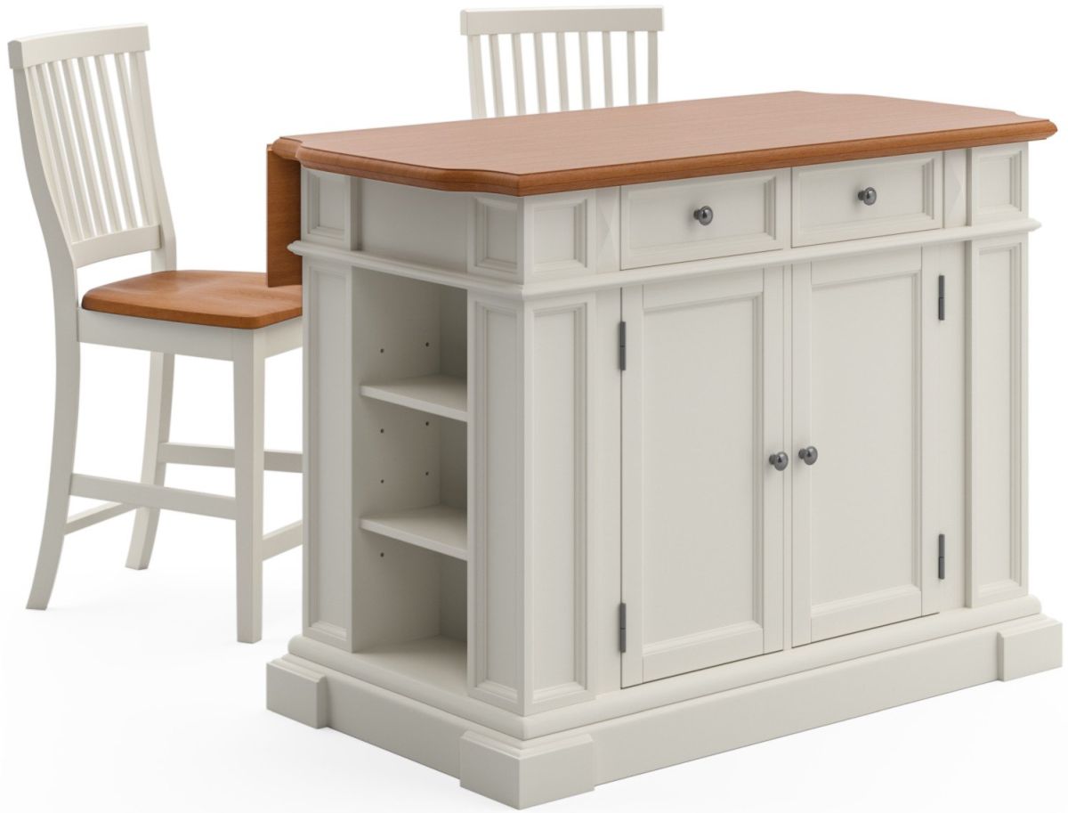 This homestyles 3-Piece Kitchen Island Set is constructed of solid hardwoods and engineered wood with a rich white finish and a distressed oak-finished top for an aged look. The island features a convenient drop leaf providing more dining and serving space, antique nickel hardware, an easy glide storage drawer, raised detail cabinet doors with adjustable shelves inside, and open storage on each end with an adjustable shelf. The 24"H bar stools feature white finish with a distressed oak-finished seat.