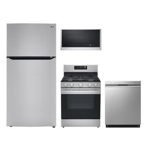 LG 4 Piece Stainless Steel Kitchen Package with steel top freezer, freestanding gas range, built in dishwasher, and over the range microwave. Read More