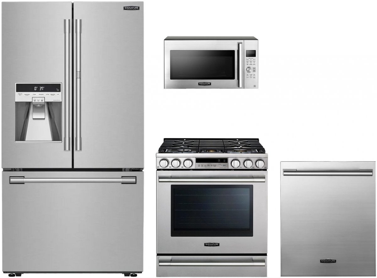 Signature Kitchen Suite 4 Piece Kitchen Package-Stainless Steel with counter depth french door refrigerator, slide in gas range, built in dishwasher and over the range microwaveRead More